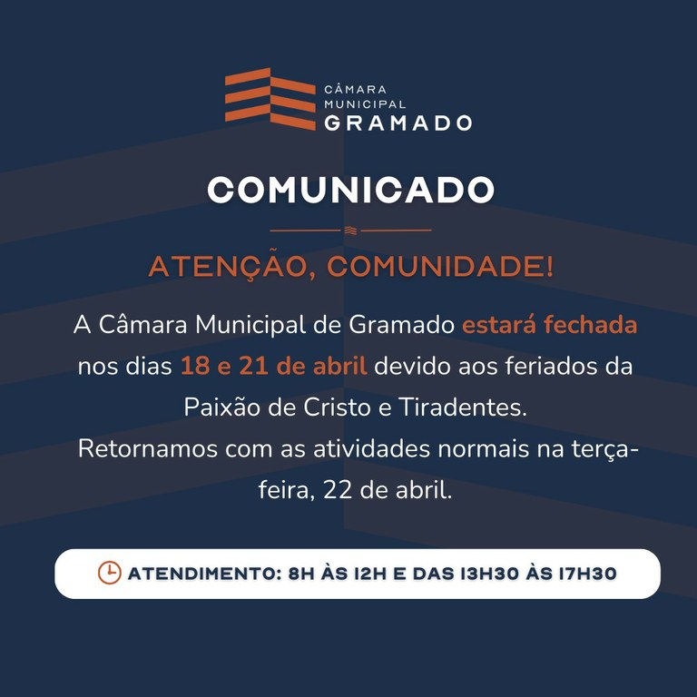 A Câmara Municipal de Gramado, por meio da Mesa Diretora, informa que estará fechada nesta sexta-feira, dia 18 de abril, em virtude do feriado municipal da Paixão de Cristo. Na segunda-feira, dia 21, também não haverá expediente em razão do feriado nacional de Tiradentes. Com isso, a Sessão Ordinária prevista para a data será transferida.